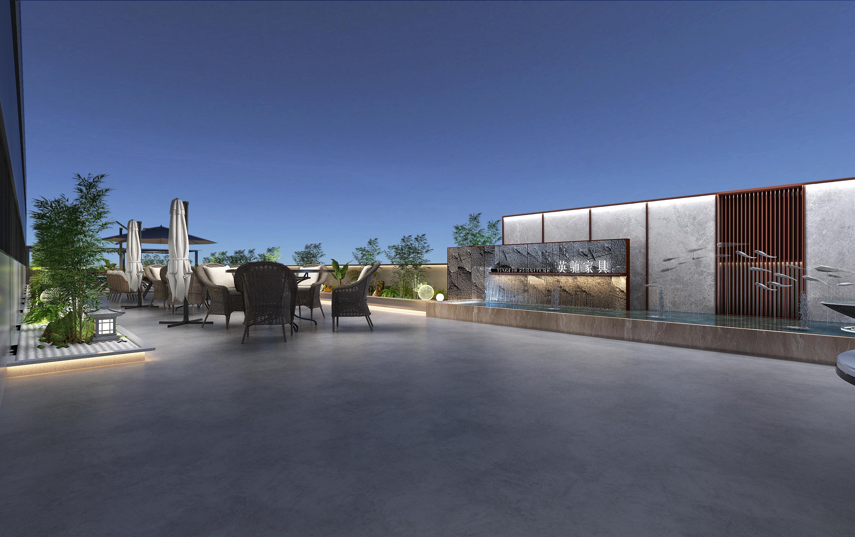 簡單的線條和塊面,打造出簡約而大氣的形象。采用石材與流水相結(jié)合,達(dá)到依山傍水意境. 燈光營造的C字與logo對(duì)應(yīng)前行,意蘊(yùn)國內(nèi)、國外兩條線“雙馳前行”。