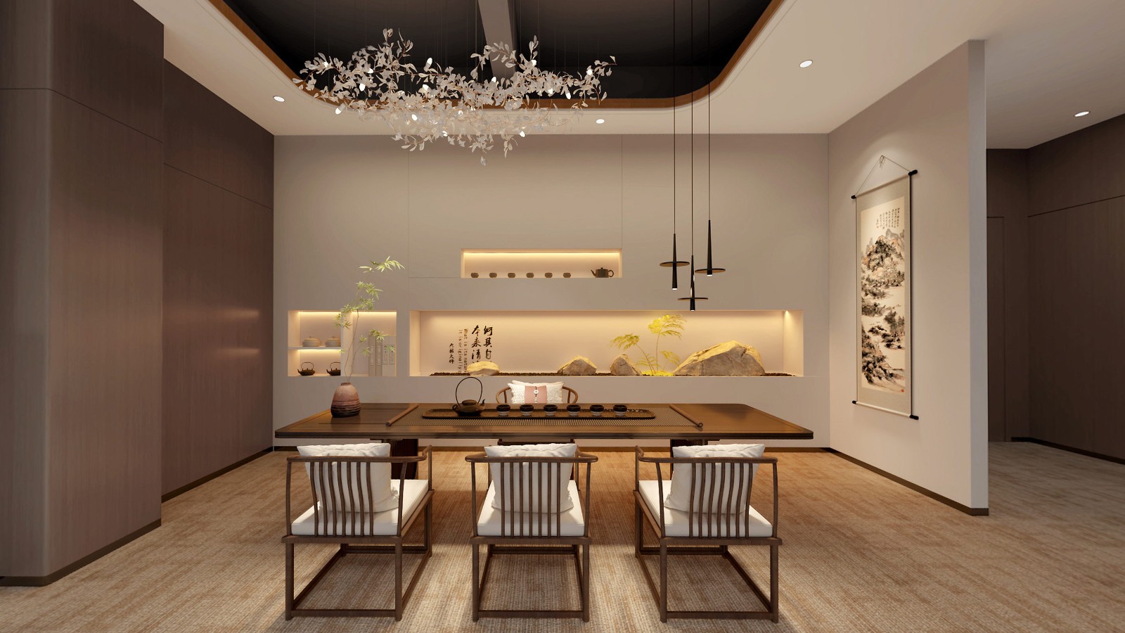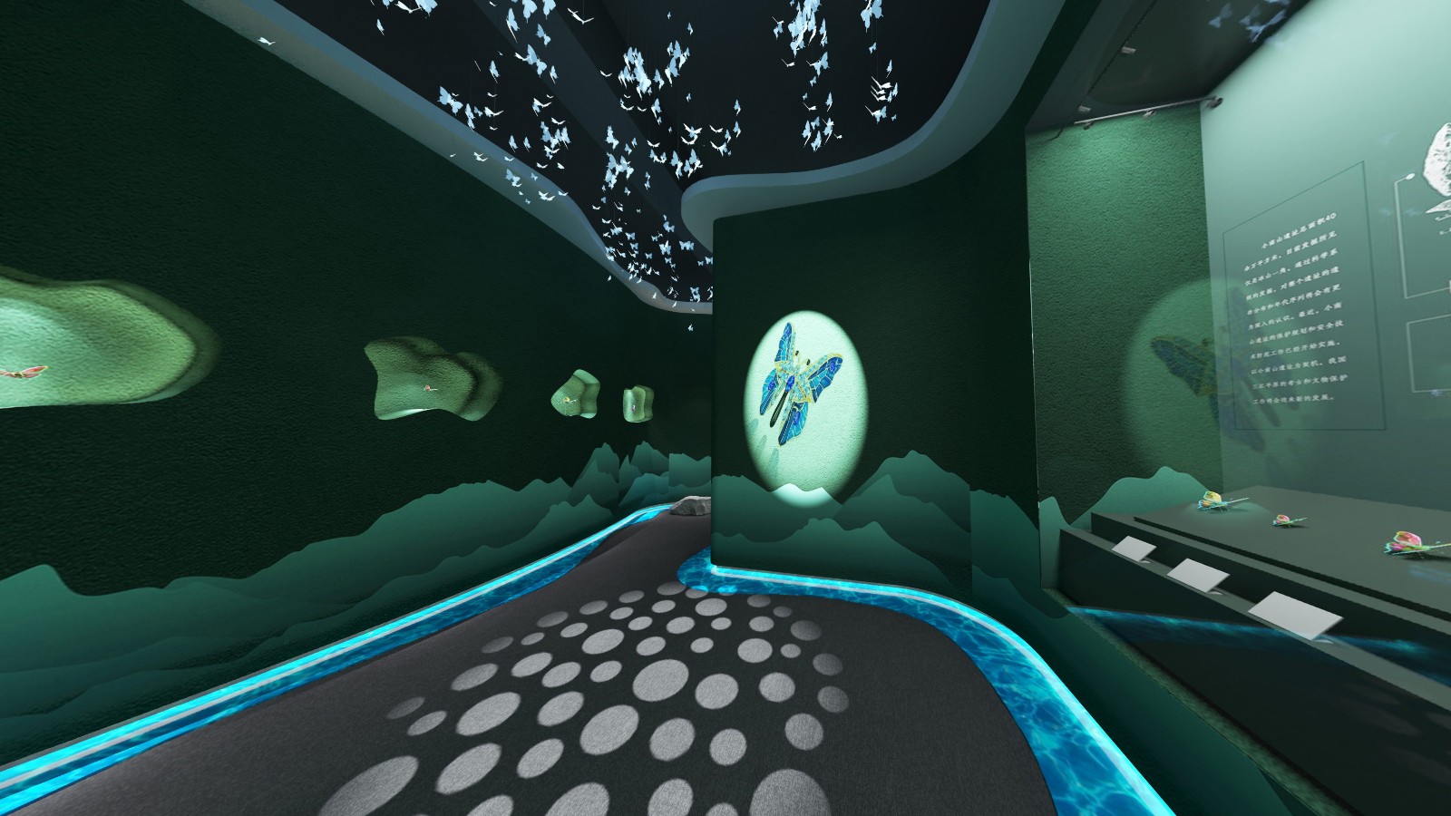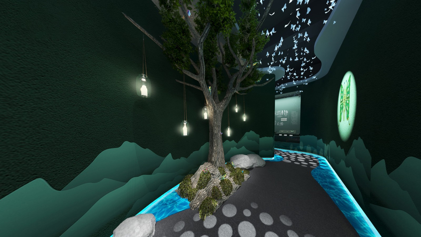 公共區(qū)域借鑒中國山水畫的意境,采用了假山、古樹、原石等造物裝飾,將山水美景移進(jìn)室內(nèi),營造出與自然和諧共生的氛圍.為進(jìn)入展廳做出了鋪墊。