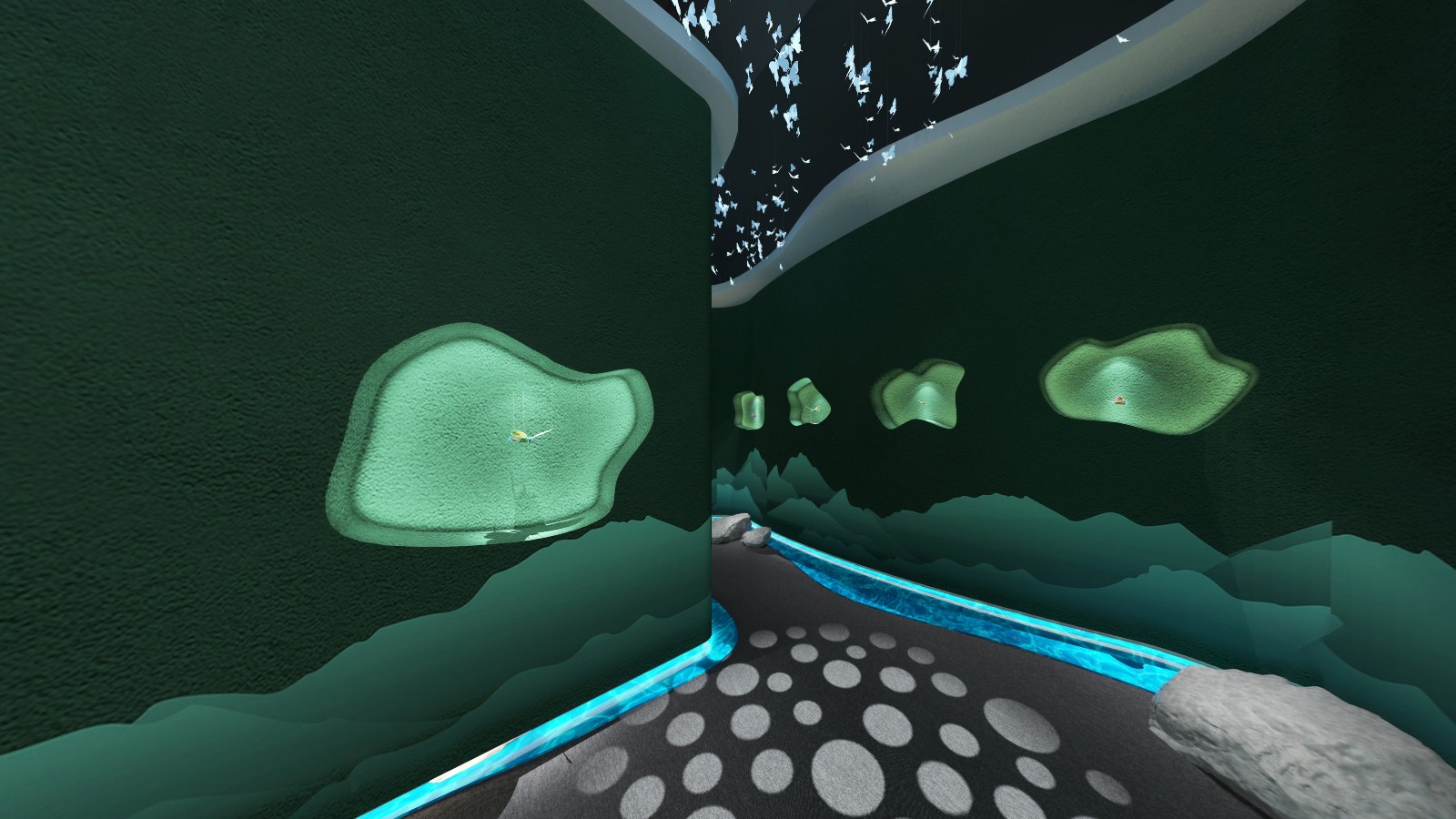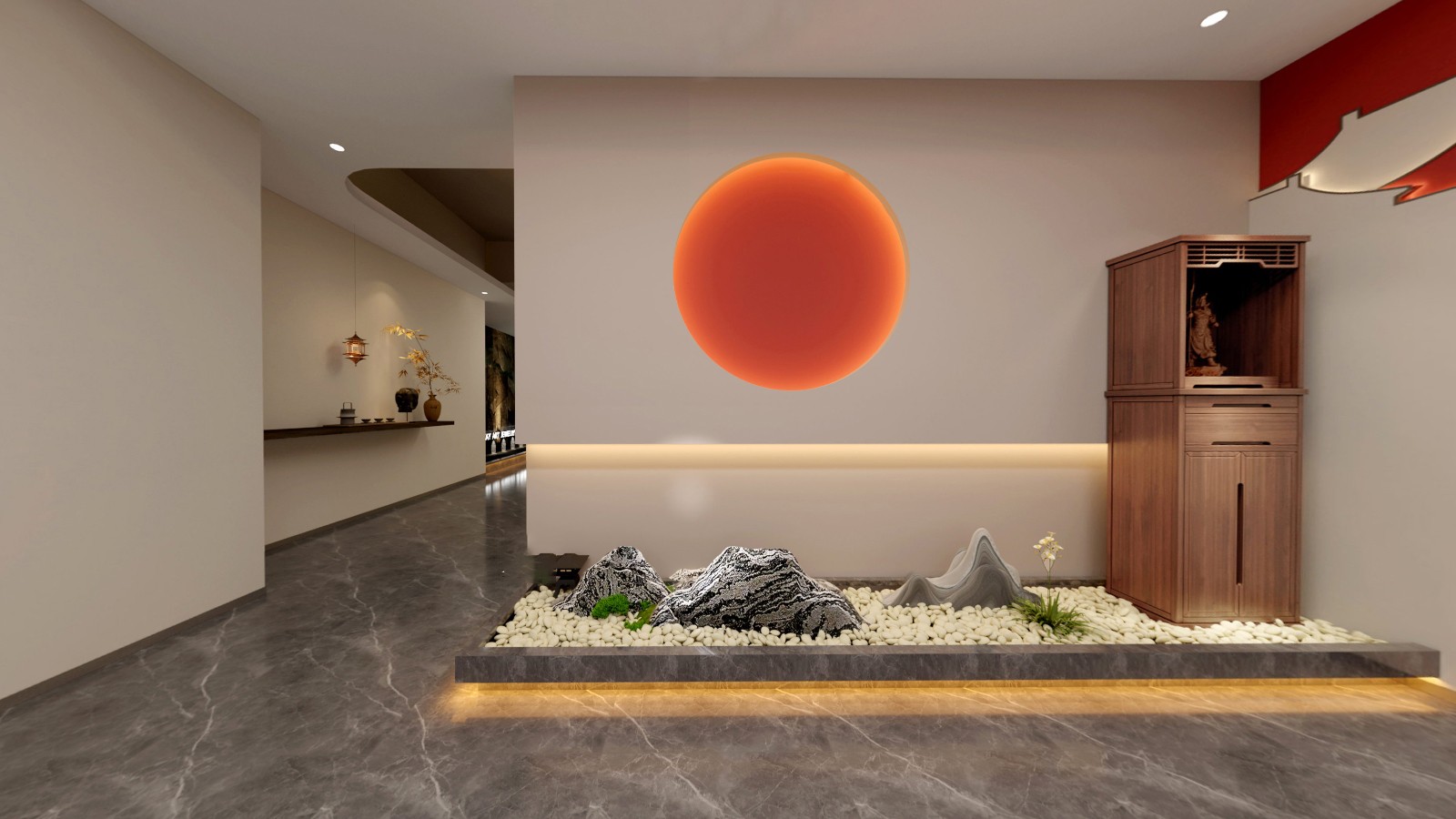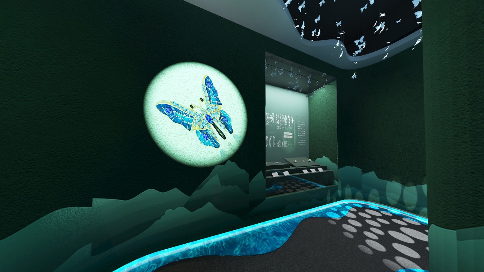 公共區(qū)域借鑒中國山水畫的意境,采用了假山、古樹、原石等造物裝飾,將山水美景移進(jìn)室內(nèi),營造出與自然和諧共生的氛圍.為進(jìn)入展廳做出了鋪墊。