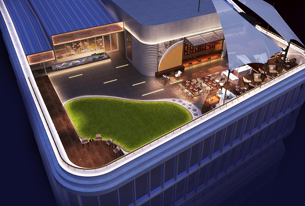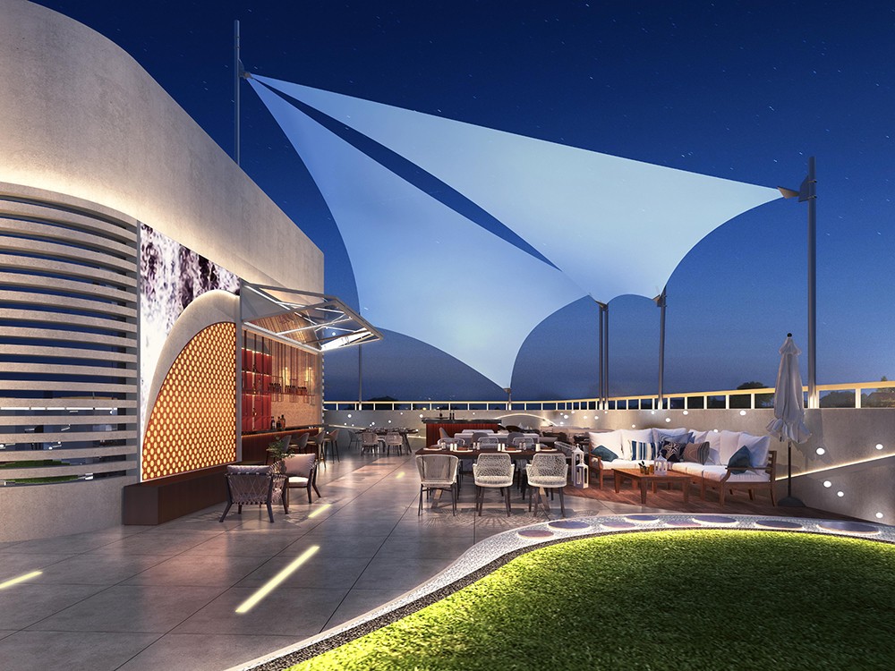 設(shè)計理念:室外開闊的明堂,水流猶如天上之水祥降而下,營造來水環(huán)繞的景觀。圍欄上跳動的線條,與天上的星空相接點點的繁星,流光似水。帶有韻味的用餐環(huán)境,以山作為背景,加上水波紋作天花,這樣可以營造一個山環(huán)水抱的祥和景象,寓意著四海朋友匯聚的地方。