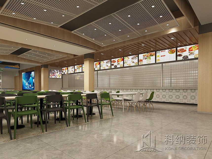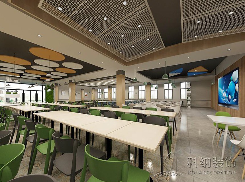 設(shè)計(jì)理念:休閑區(qū)的設(shè)計(jì)應(yīng)用鮮艷色彩,課后的學(xué)生來(lái)到體驗(yàn)休閑愜意讓人心曠神怡。學(xué)術(shù)交流區(qū)應(yīng)用了可組合的桌椅做搭配,造型吊燈使整個(gè)空間顯得生動(dòng)有趣考慮到多人活動(dòng),方便學(xué)生自由組合。團(tuán)體就餐區(qū)橫向舒展的開(kāi)放式桌椅布局給予一層空間通透且自由的氛圍,由此顯露出交互的趣味性與工作的靈活性。大眾就餐區(qū)的設(shè)計(jì)以暖色調(diào)為主,以色彩鮮艷的桌椅做點(diǎn)綴,為空間增加活躍氣息。