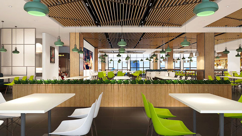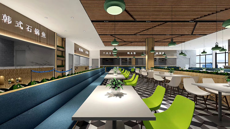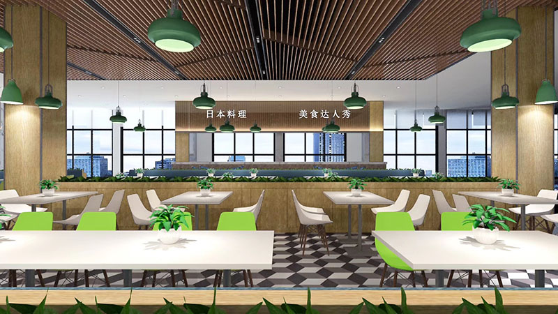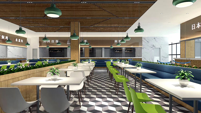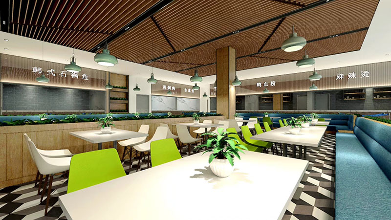 設(shè)計理念:將飲食文化與現(xiàn)代快餐空間設(shè)計相結(jié)合,打造富有內(nèi)涵的互動式空間。充分體現(xiàn)空間尺度,優(yōu)化食堂環(huán)境品質(zhì),營造健康、安全、舒適的就餐環(huán)境。