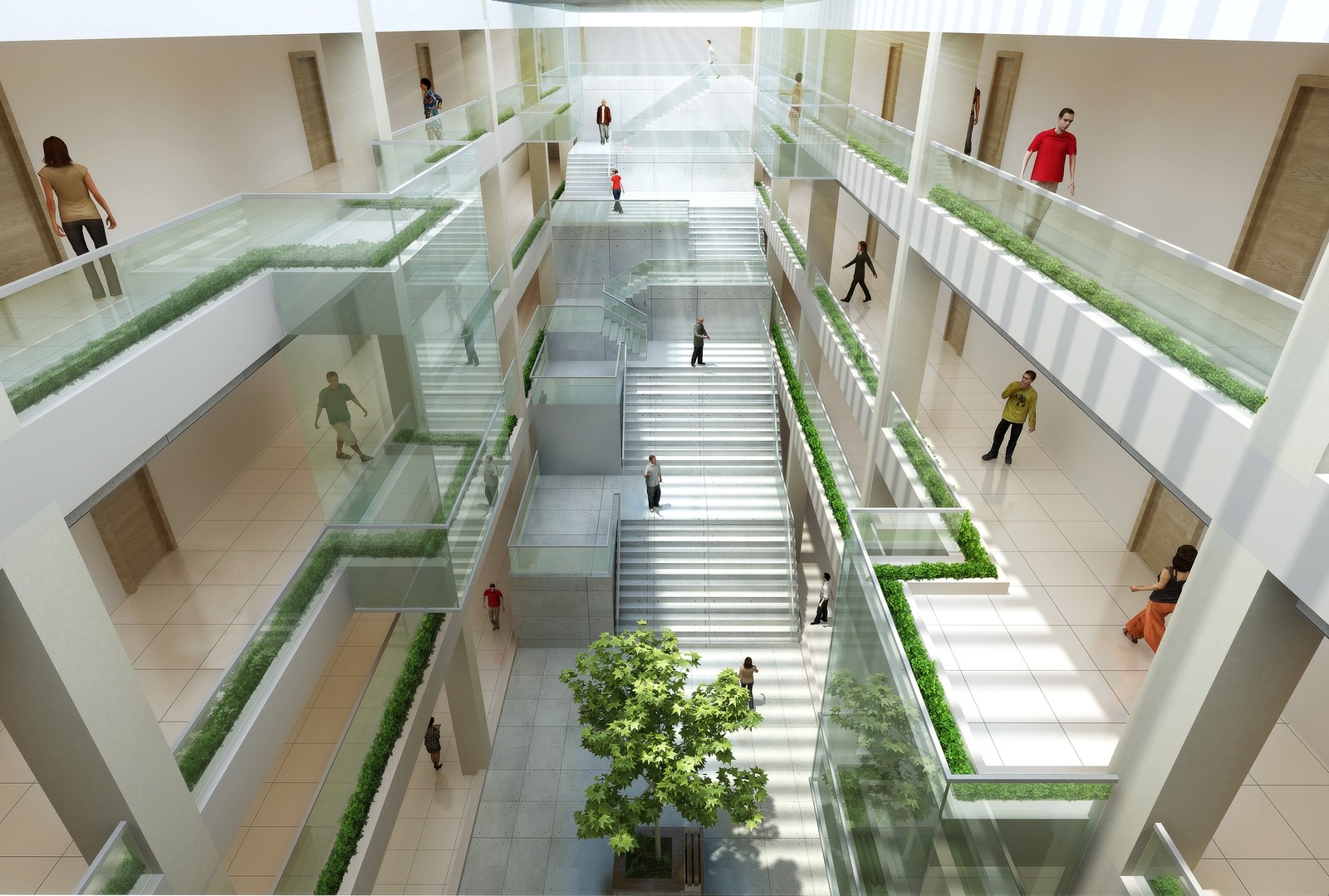 設(shè)計理念:將建筑與城市界面、自然環(huán)境有機融合,形成富有活力和動感的城市半公共空間,強調(diào)孵化器的活力性和多樣性。設(shè)有大平臺連接各建筑單體,各不同功能分區(qū)可在二層平臺處進行聯(lián)系交流,提高辦公區(qū)友好協(xié)作的氛圍。每棟樓的屋頂設(shè)有景觀庭院以提高基地的景觀環(huán)境,也為地區(qū)景觀環(huán)境增添魅力。底層內(nèi)庭院設(shè)置橢圓形中央大草坪,各棟建筑底層均有開口通向內(nèi)庭院,二層大平臺中部挖空,可俯瞰底層中央大草坪,大平臺靠近建筑的部分也都局部挖空,使底層的綠化系統(tǒng)可在垂直方向向上滲透,形成一個多維度的立體景觀。