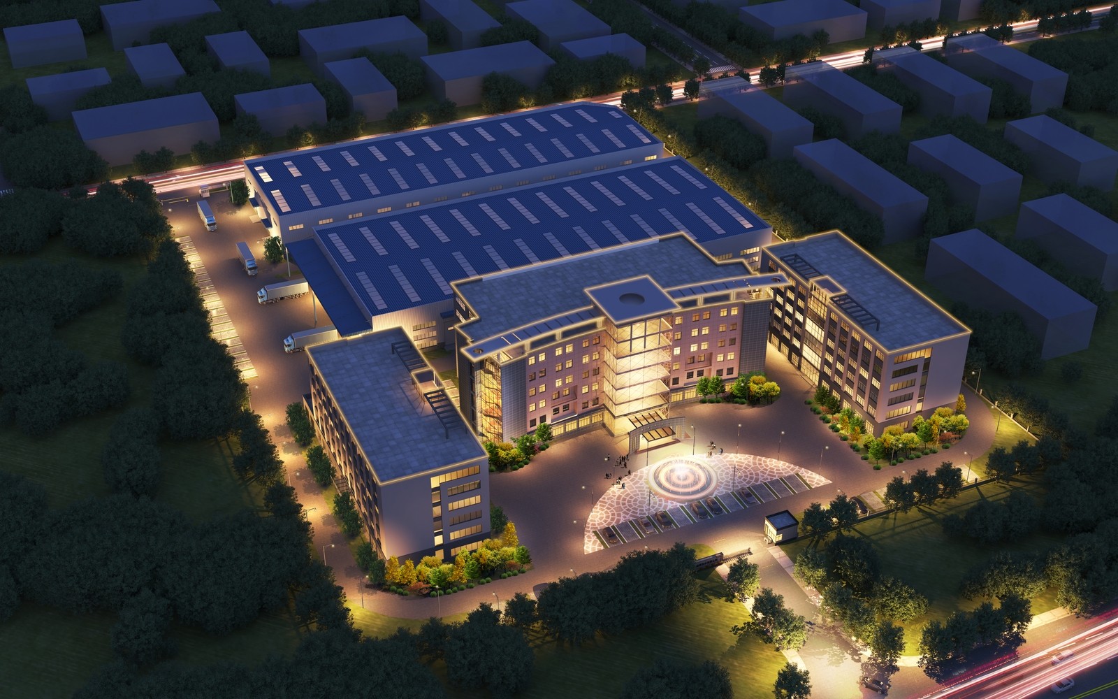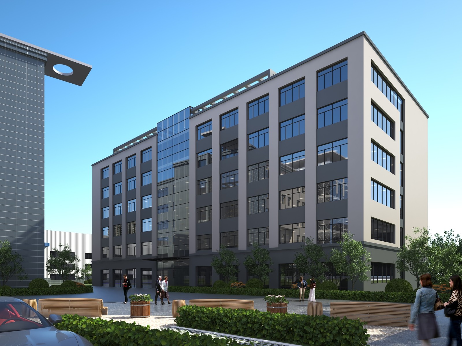 設(shè)計理念:廠房單體樓棟呈院落式布局,共同圍合出內(nèi)部怡人的園區(qū)環(huán)境,在多個不同主題的庭院中,人們可以感受到建筑體量的層次感和空間變化,同時也可以享受到自然光線和景觀的美好,為員工的交流和互動帶來更多流通性和便利性,創(chuàng)造盡可能多的城市性開放綠色空間。