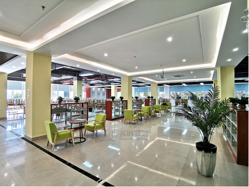 此次項(xiàng)目是廣東科技學(xué)院南城校區(qū)圖書館閱覽室裝修工程。整個(gè)圖書館閱讀空間主色調(diào)定為白色、木色、淡綠色,還原清新自然的氛圍,喚醒青春歲月與校園生活氣息。